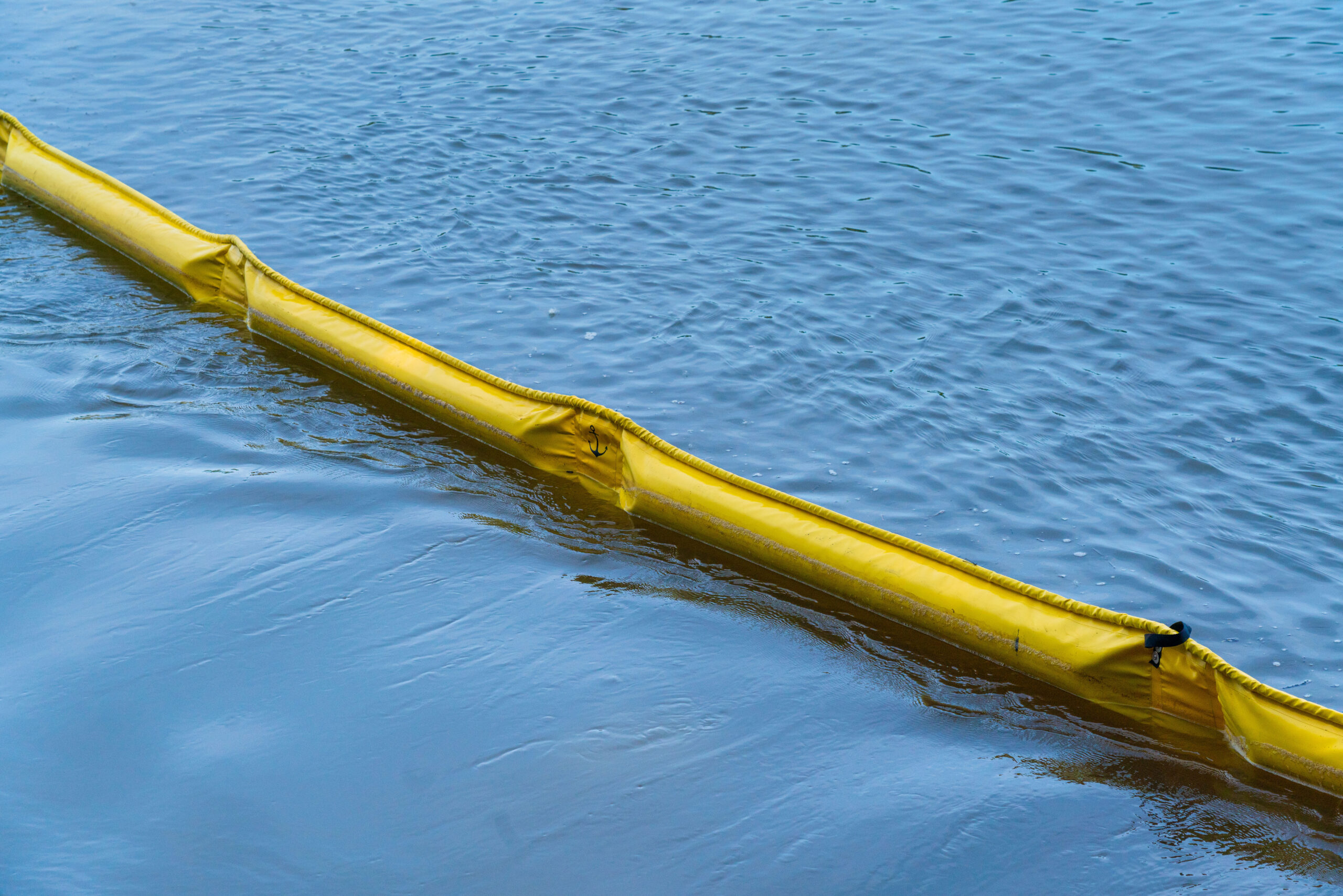 Photo of people in a boat placing containment booms into a river.